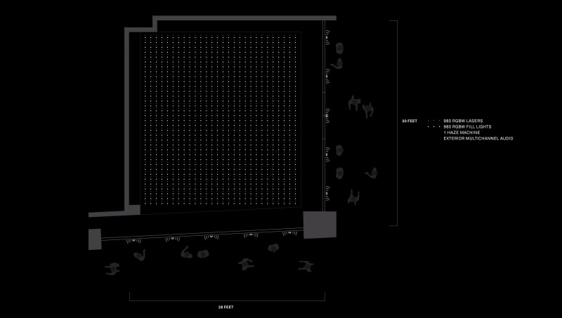 The solution is an installation of nearly 2000 choreographed and responsive lights inside the store, with coordinated perimeter audio and sensors outside the store. At night, lasers and lights in constant flux flood the entire retail interior with a constant churn of structures, patterns, and color, creating dynamic, volumetric visualizations of the client's brand and technology. Further dimensionalizing these expressions with immediate responsive behaviors creates a benevolent feedback loop, tangibly connecting brand expression to human experience.