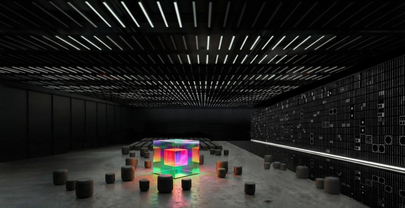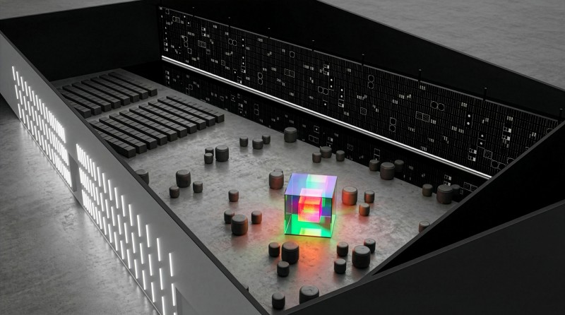 Designed for a one-day event, this 10,000 square foot space translated the company’s online brand vocabulary and content into a physical space and expressed across time through tightly choreographed elements including the LED media wall’s presentation and performative content, the performative and functional ceiling and corridor entry sequence light installations, zoned audio and lighting, and the dichroic and LED “brain” demonstrating the company’s blockchain ecosystem with real-time reporting.